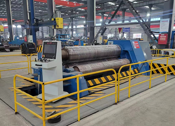 第二步是工作輥作進給運動,即進行三點彎曲,有的卷板機是上輥作壓下進給,有的是下輥或側輥作向上的進給運動,為敘述方便,根據(jù)相對運動的原理,將工件和下輥或側輥看作靜止不動的,上輥作壓下運動:卷圓筒工件上輥壓下時與下輥平行,卷錐筒工件上輥壓下時與下輥傾斜:壓下量越多,工件與上輥接觸的母線及附近曲率越大;第三步是通過工作輥的回轉運動讓工件回轉,同時保證上輥的壓下量不變,使工件的每一個母線具有相同的曲率或曲率分布,成為圓筒和錐筒。